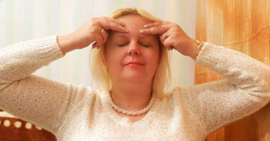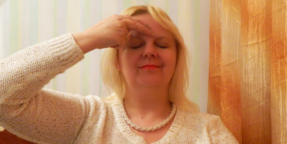 2. Zamykam oczy i przyjmuję pozycję "dekodowania" – dwoma palcami każdej dłoni dotykam czoła w pobliżu czakry "Trzeciego Oka".